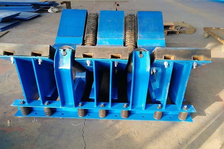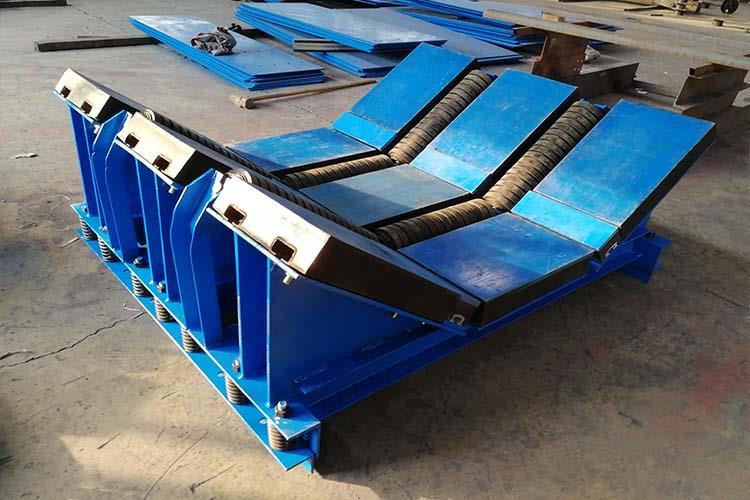 2、皮带缓冲床,皮带落料区专用缓冲床是一种用于带式输送机输送带的缓冲滑槽,又名缓冲床,由一个钢制支撑架和若干个缓冲条构成,其中,钢制支撑架的上侧固定设置有一个缓冲滑槽,缓冲垫的上侧固定设置有一个支撑表面层,支撑表面层由复数个高分子量聚乙烯耐磨双抗板排列构成。